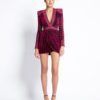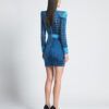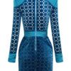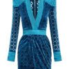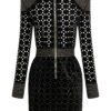 LASERCUT METALLIC VELVET MINI DRESS WITH WEDGE SHOULDER ACCENTS AND UNLINED WRAP STYLE SKIRT.