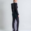 THE WRAP STYLE LONG SKIRT IS SHEER AND FEATURES A HIGH FRONT SPLIT