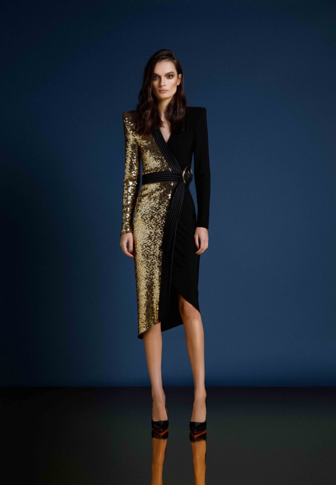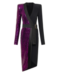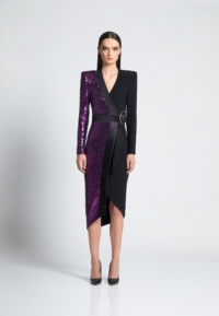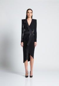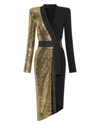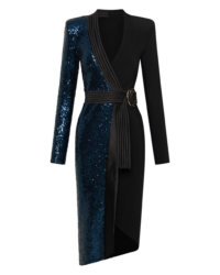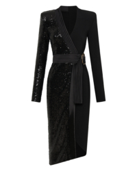 Introducing our TAKE OFF dress, a must-have addition to your wardrobe. Crafted from knit jersey and knit sequined material, this wrap style dress offers superior comfort and durability sinching in the waist. Designed with the modern woman in mind, its sleek and stylish silhouette effortlessly accentuates your curves. Whether you’re heading to a casual outing or a formal event, this versatile dress is the perfect choice. It showcases exceptional craftsmanship and attention to detail. Elevate your style with our TAKE-OFF dress and make a fashion statement wherever you go.