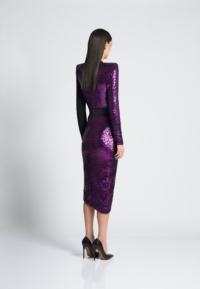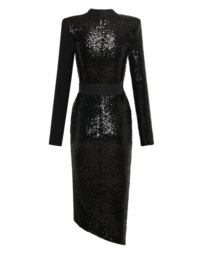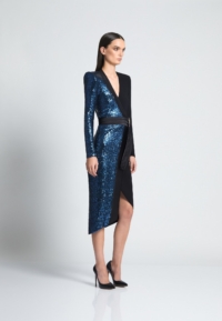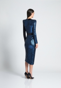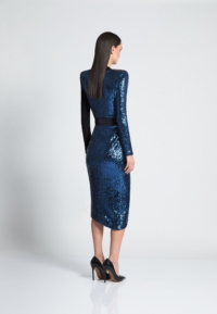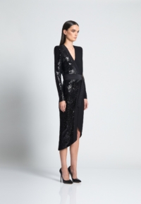 A FULLY LINED JERSEY WRAP /KNIT SEQUIN MIDI DRESS WITH SATIN PANELLING, STITCHED SATIN RING BELT TO CLOSE & SHOULDER ACCENTS. FLEXIBLE FIT FOR ALL BODY SHAPES.