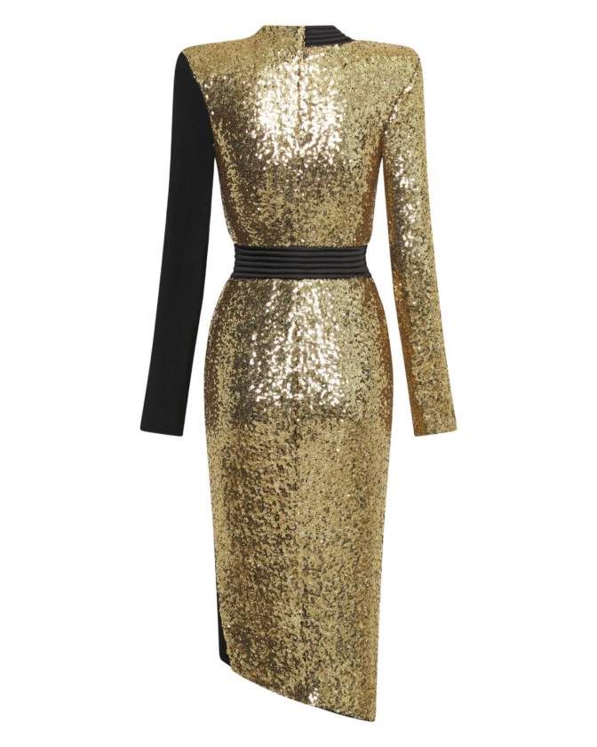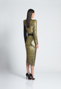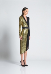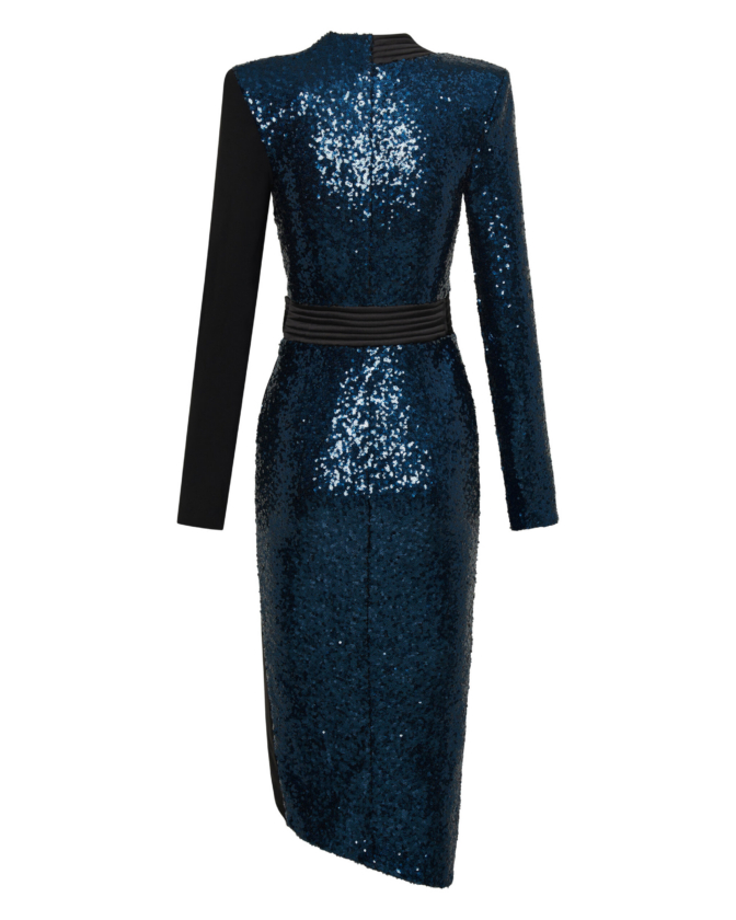COLOUR-CONTRASTED SEQUIN AND JERSEY WRAP STYLE MIDI DRESS WITH STITCHED SATIN TIE AND RINGS TO CLOSE AND SHOULDER ACCENTS.