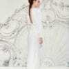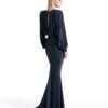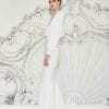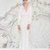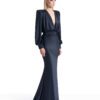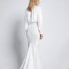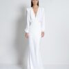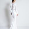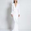 A BIAS CUT STRETCH SATIN GOWN WITH LONG BILLOW SLEEVES, SHOULDER ACCENTS, DRAPED BODICE AND SIGNATURE STITCHED SATIN DETAIL ON WAIST AND CUFFS.