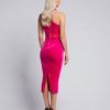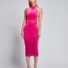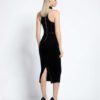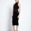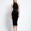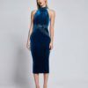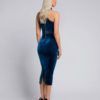 FULLY LINED VELVET MIDI DRESS WITH SIDE POCKET FEATURE AND METALLIC STITCHED PANELLING.