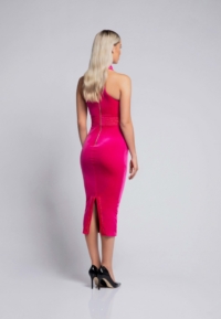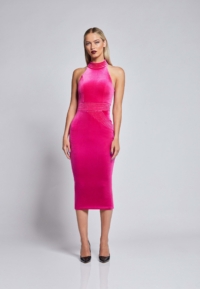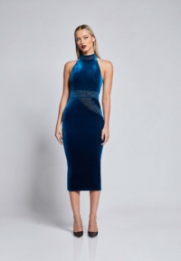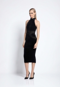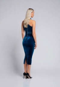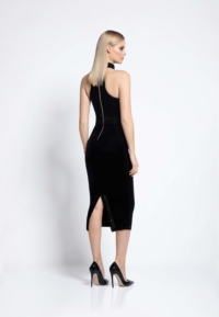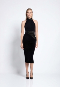 FULLY LINED VELVET MIDI DRESS WITH SIDE POCKET FEATURE AND METALLIC STITCHED PANELLING.