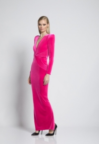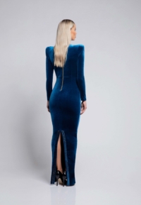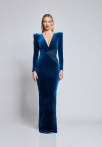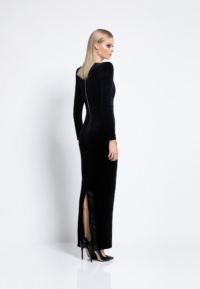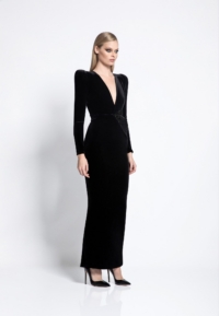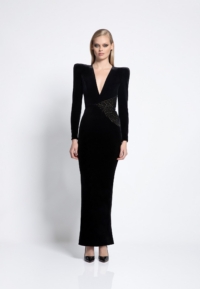 FULLY LINED STRETCH VELVET GOWN WITH SIDE POCKET DETAIL, GOLD STITCHING AND CURVED SHOULDER ACCENTS.