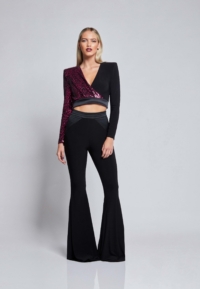 A fully lined jersey flared pant with our signature stitched satin waistband and exposed zip.