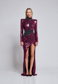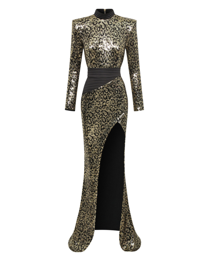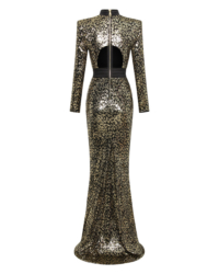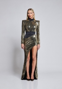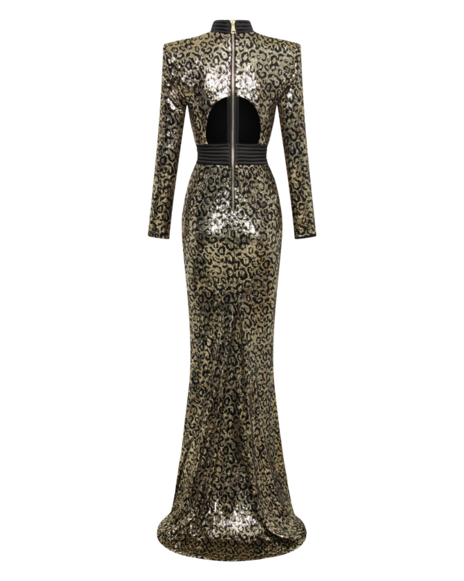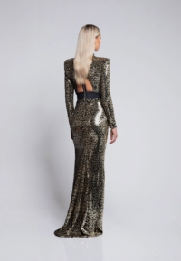 FULLY LINED ANIMAL STRETCH SEQUIN GOWN WITH STITCHED SATIN PANELLING, ASYMETRICAL SKIRT, OPEN BACK & SHOULDER ACCENTS.