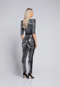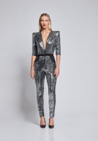 FULLY LINED ANIMAL STRETCH SEQUIN JUMPSUIT WITH STITCHED SATIN PANELLING, CENTRE FRONT ADJUSTABLE ZIP AND SHOULDER ACCENT.