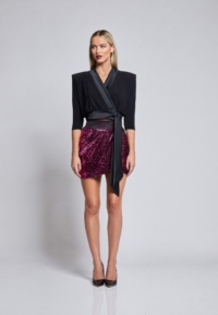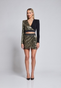 FULLY LINED ANIMAL SEQUIN WRAP STYLE MINI SKIRT WITH METALLIC STITCHED SATIN PANELLING.