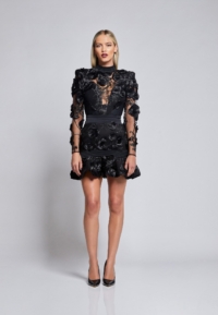 PARTIALLY SHEER FLORAL MESH MINI DRESS WITH STITCHED SATIN PANELLING,OPEN BACK DETAIL, FLARED HEM & SHOULDER ACCENTS.