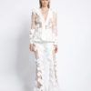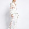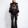 PARTIALLY SHEER FLORAL MESH FLARED PANT WITH STITCHED SATIN WAISTBAND AND PANELLING