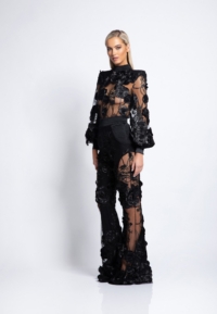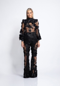 PARTIALLY SHEER FLORAL MESH FLARED PANT WITH STITCHED SATIN WAISTBAND AND PANELLING