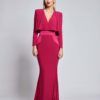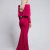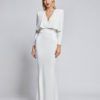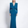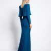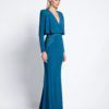 FULLY LINED JERSEY GOWN WITH DRAPED OVERLAY BODICE FEATURE, STITCHED SATIN PANELLING AND SHOULDER ACCENTS.