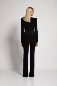 FULLY LINED STRETCH JERSEY JUMPSUIT WITH BOOT CUT PANT, FAUX FUR LAPEL, SHOULDER ACCENTS, PLUNGE FRONT AND SATIN PANELLING