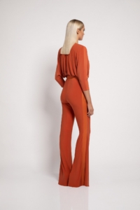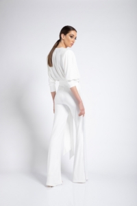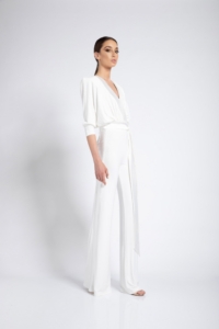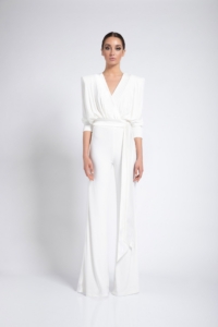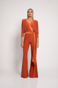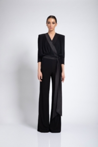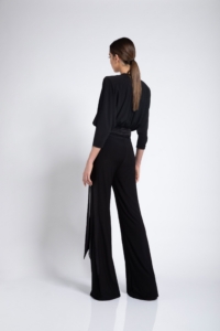 JERSEY WIDE LEG JUMPSUIT WITH SIDE PANT ZIP AND WRAP STYLE TOP. SHOULDER ACCENTS & WAIST TIES