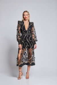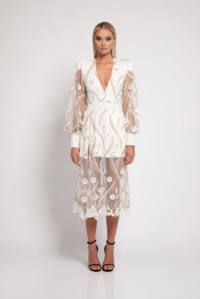 THE STUNNING WHITE RABBIT DRESS IS MADE FROM INTRICATE EMBELLISHED MESH AND DELICATE LACE TRIMMING. IT IS AVAILABLE IN EITHER BLACK OR WHITE.